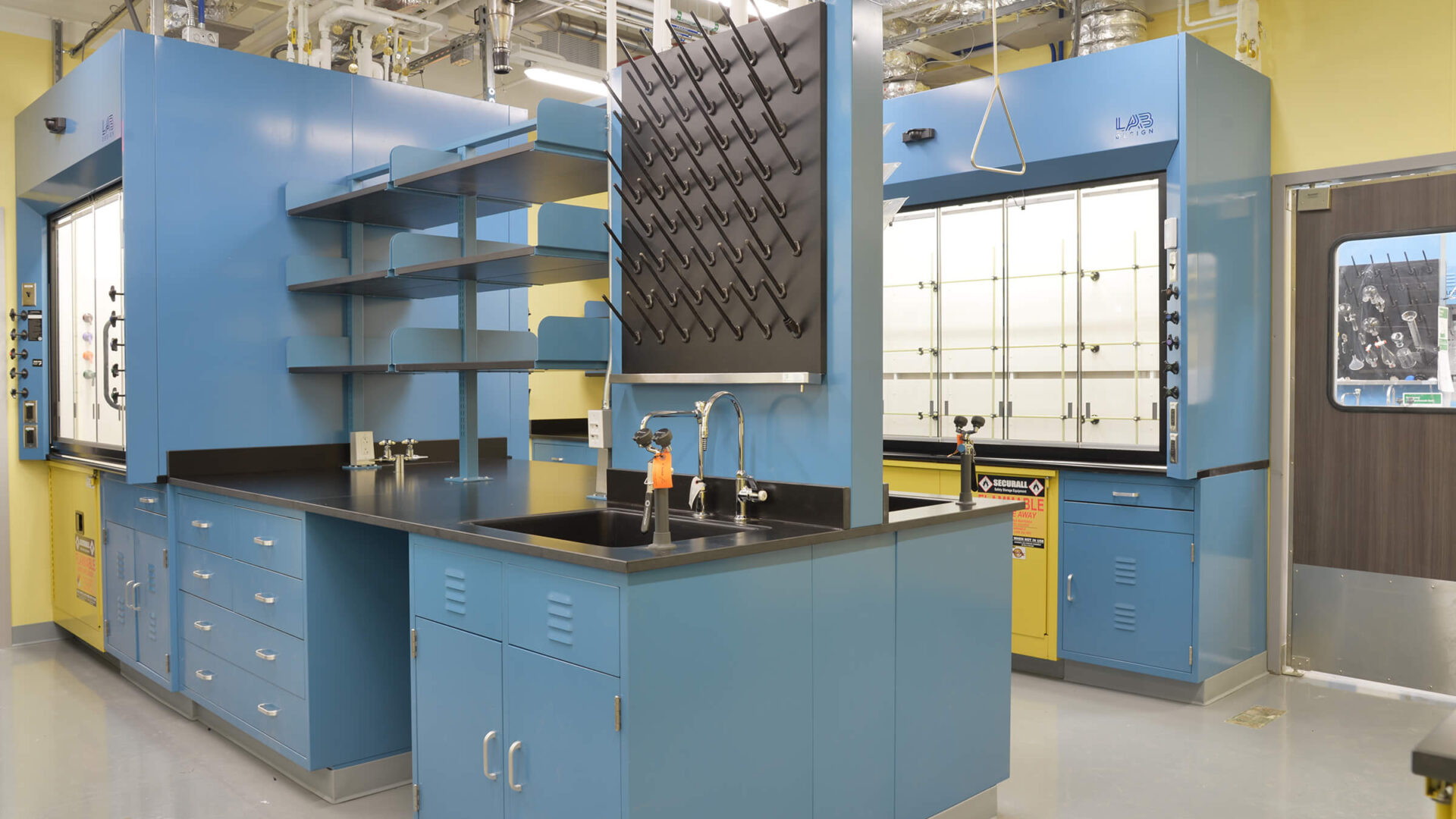 Through another design build effort, the University of Rochester Department of Chemistry sought to renovate the Paradine & Kennedy Labs that reside on the 4th floor of Hutchison Hall. In conjunction to each other, The Paradine group develops chemical reactions to make topologically complex organic molecules, and the Kennedy group is directed toward the development of new and sustainable strategies for catalysis utilized in Dr. Paradine’s research. The space includes 8 appropriately sized fume hoods, a solvent system and various lab services with adjustable and fixed casework per the doctor’s preferences. To accommodate 11 students involved in the doctors’ research a student office space with new finishes and workstations has been provided adjacent to the wet laboratory.