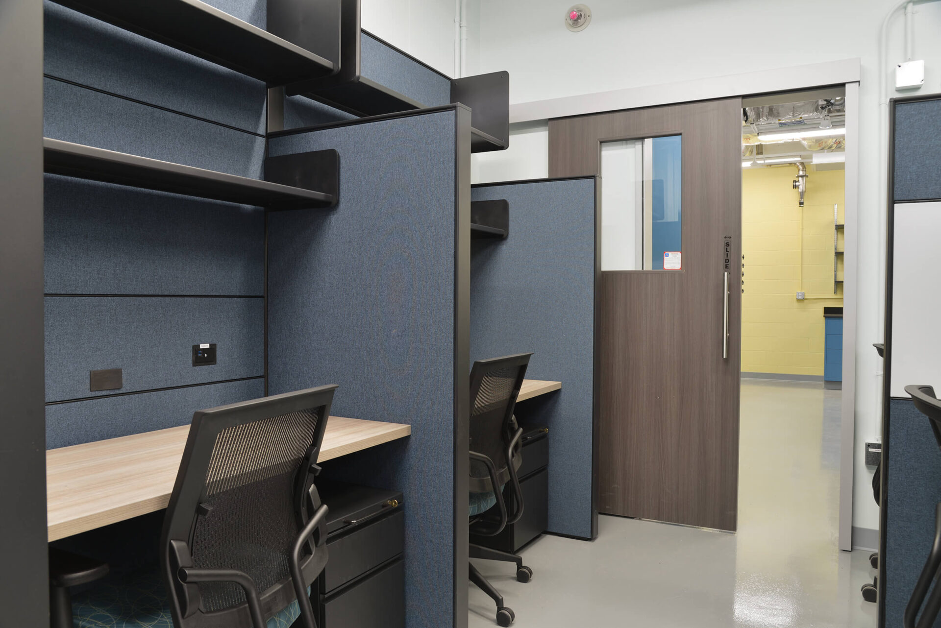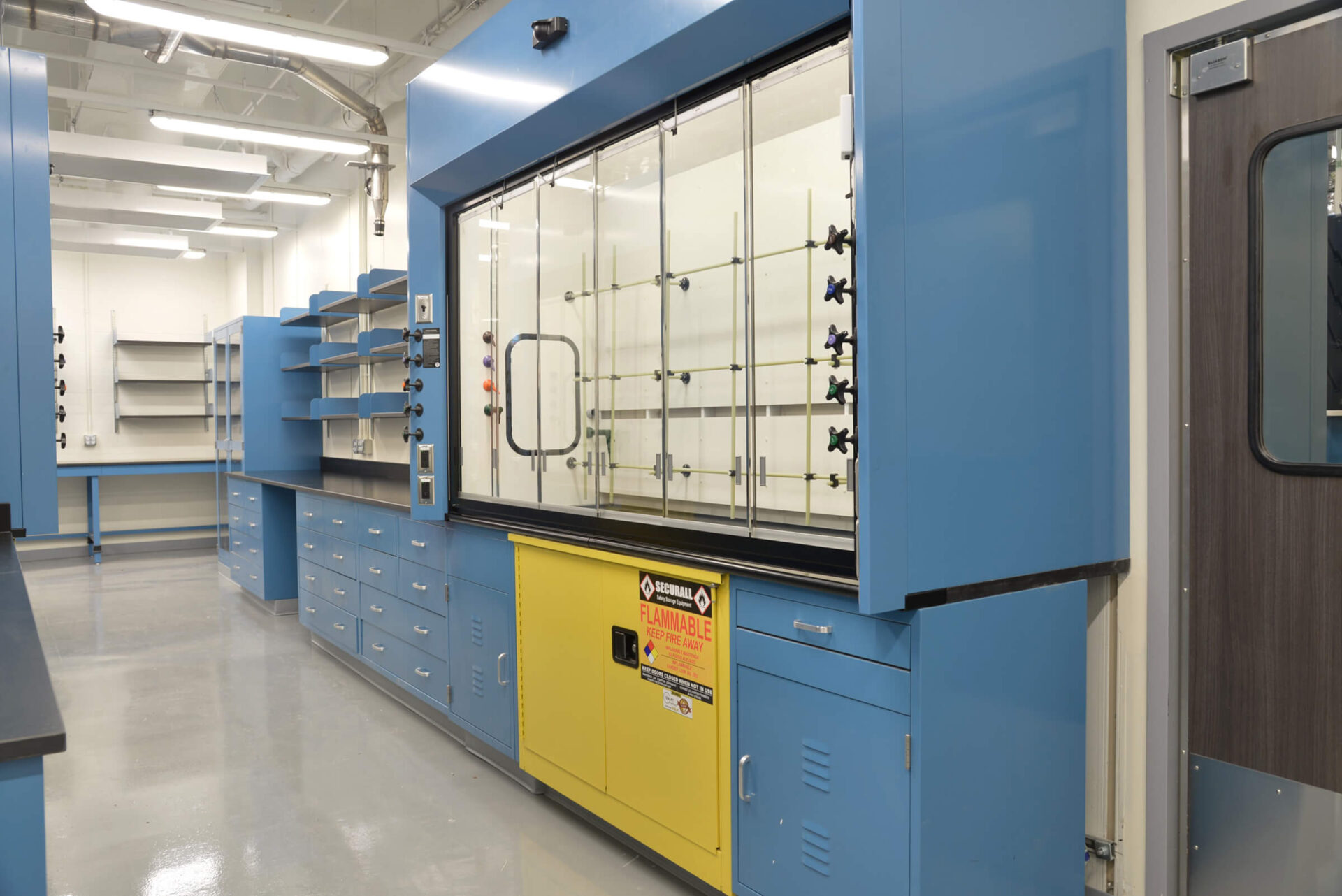 Through another design build effort, the University of Rochester Department of Chemistry sought to renovate the Paradine & Kennedy Labs that reside on the 4th floor of Hutchison Hall. In conjunction to each other, The Paradine group develops chemical reactions to make topologically complex organic molecules, and the Kennedy group is directed toward the development of new and sustainable strategies for catalysis utilized in Dr. Paradine’s research. The space includes 8 appropriately sized fume hoods, a solvent system and various lab services with adjustable and fixed casework per the doctor’s preferences. To accommodate 11 students involved in the doctors’ research a student office space with new finishes and workstations has been provided adjacent to the wet laboratory.