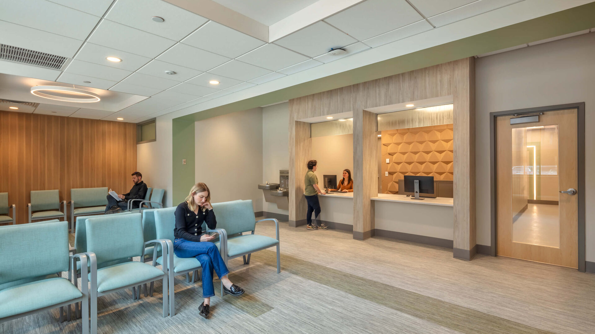 Incorporating strategic wayfinding opportunities by way of key landmarks into the design gives patients control of their experience and reduces stress. Material transitions, recessed lighting and wall graphics continue to orient patients naturally and organically. Natural light, biophilic materials, and soft tonal palettes create a restorative environment, and daylight and views enhance the waiting area. Warm wood tones, nature-inspired graphics, and nearby changing areas support a further support a stress-free patient flow.